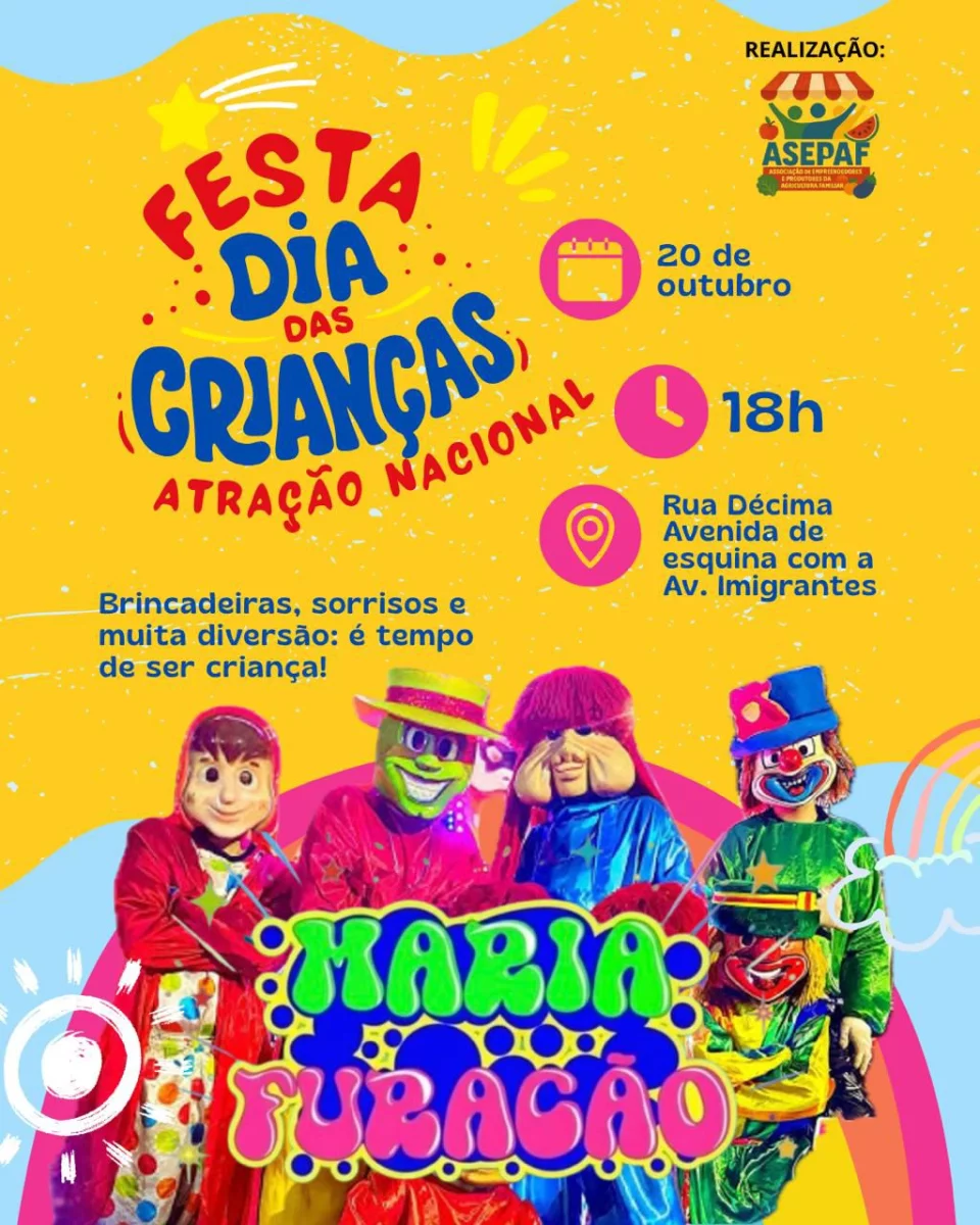 A Associação de Empreendedores e Produtores da Agricultura Familiar (ASEPAF) convida toda a população para participar de uma grande festa alusiva ao Dia das Crianças, que acontecerá na tradicional Feira da Décima Avenida, localizada no cruzamento da Décima Avenida com a Avenida dos Imigrantes, no dia 20 de outubro, a partir das 19 horas.