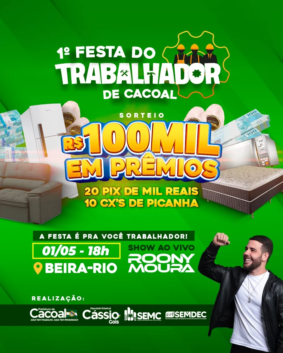 A Prefeitura de Cacoal anunciou a realização da 1ª Festa do Trabalhador, que será realizada no dia 1º de maio, a partir das 18h, no Espaço Beira Rio. O evento, organizado em homenagem aos trabalhadores do município, promete ser uma das maiores celebrações já promovidas na cidade, conforme destacou o prefeito Adailton Fúria.