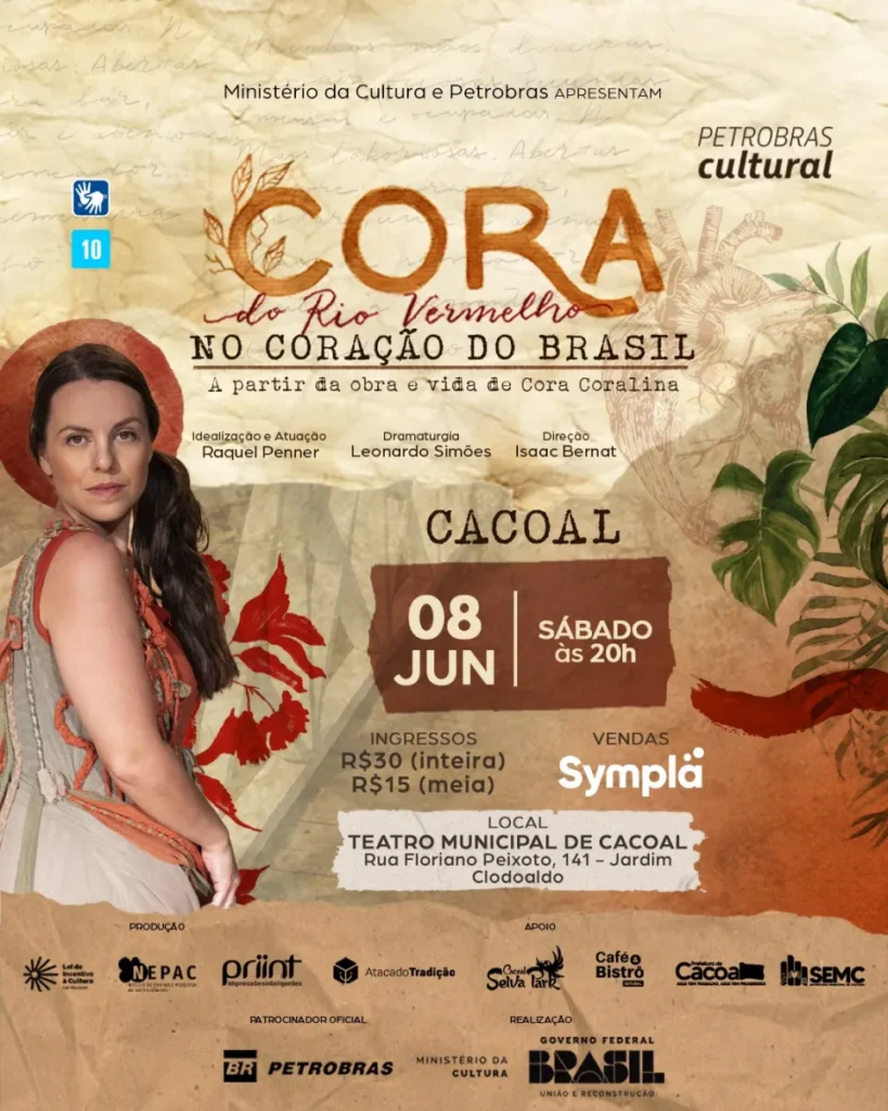 No próximo dia 08 de junho, o Teatro Municipal de Cacoal, em Rondônia, abrirá suas portas para uma noite de arte e cultura com a apresentação do espetáculo “Cora do Rio Vermelho – No Coração do Brasil”. Estrelado pela talentosa Raquel Penner e baseado na vida e obra da poetisa goiana Cora Coralina, o evento promete uma jornada emocionante repleta de poesia e sensibilidade.