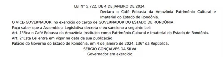 O Governo de Rondônia decretou, na última quinta-feira (4), o Café Robusta Amazônico como Patrimônio Cultural e Imaterial do estado. A data coincide com o aniversário de instalação do Estado de Rondônia.