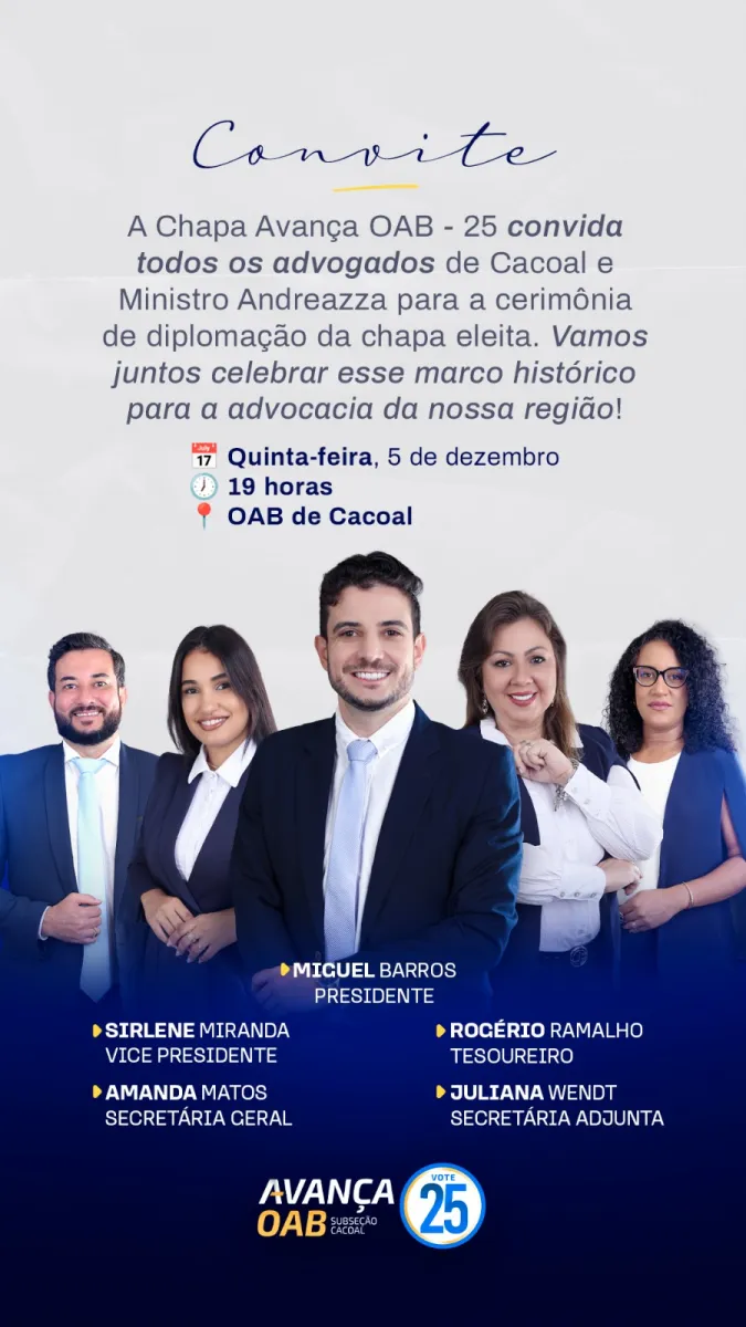 CACOAL – Na próxima quinta-feira, 5 de dezembro, a advocacia de Cacoal e Ministro Andreazza será palco de um importante evento para a categoria. A Chapa Avança OAB – 25 realizará a cerimônia de diplomação da chapa eleita, em um momento considerado histórico para a região. O encontro está marcado para as 19 horas, na sede da OAB de Cacoal.