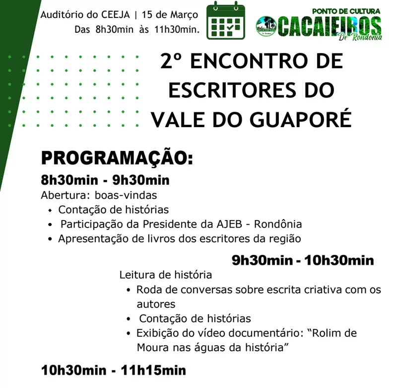 A Coordenação do “Ponto de Cultura CACAIEIROS de Rondônia” convida toda a população para o II Encontro dos Escritores do Vale do Guaporé, que acontecerá no próximo dia 15 de março de 2025, das 8h30 às 11h30, no Auditório do Centro Estadual de Educação de Jovens e Adultos Governador Jorge Teixeira (CEEJA).