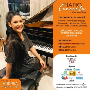 A grande estrela da noite será a pianista Andréa Figueiredo. Nascida em Porto Velho, RO, Andréa é uma figura de destaque na música da região norte. Ela é membro da Academia Rondoniense de Letras, Ciências e Artes e tem uma carreira recheada de sucessos.