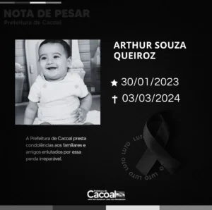Com corações pesarosos, o Prefeito Municipal de Cacoal, Adailton Fúria, e todos os servidores municipais, expressam sua mais profunda tristeza pelo falecimento do pequeno Arthur Souza Queiroz. Nascido em 30 de janeiro de 2023, Arthur partiu prematuramente em 03 de março de 2024, deixando um vazio imenso em nossos corações.