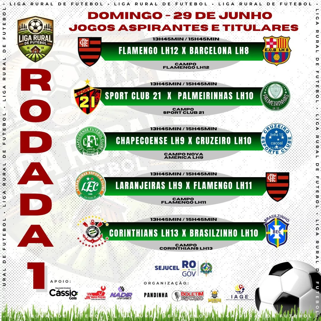 A Liga Rural de Futebol inicia as atividades com a participação de 44 equipes, sendo 22 equipes na Categoria Aspirante e 22 equipes na Categoria Titular. O Campeonato da Liga Rural de Futebol inicia neste domingo, dia 29, com 5 jogos, nas duas Caategorias.
