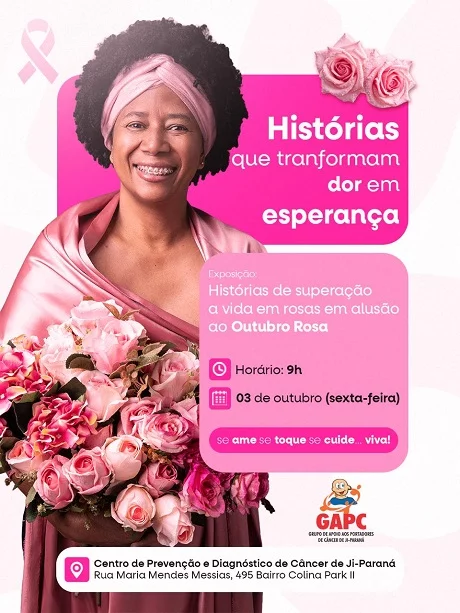 Nesta sexta-feira (3), às 9h, ela participa da solenidade de abertura da Exposição Histórias que Transformam Dor em Esperança, realizada pelo Grupo de Apoio às Pessoas Portadoras de Câncer de Ji-Paraná (GAPC), no Centro de Prevenção e Diagnóstico de Câncer (Hospital de Amor).