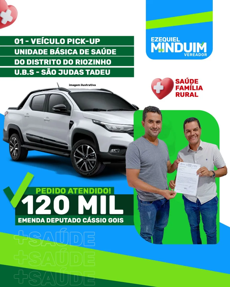 Em uma iniciativa que promete melhorar significativamente os serviços de saúde no distrito do Riozinho, o deputado Cássio Gois destinou 120 mil reais para a aquisição de uma pick-up cabine dupla, completa e zero quilômetro, para a Unidade Básica de Saúde (U.B.S.) São Judas Tadeu. Esta ação resulta de uma solicitação do vereador Ezequiel Minduim (AVANTE) e representa um importante avanço para a comunidade. Os recursos já iniciaram os trâmites e a previsão é que ainda este ano a pick-up se torne uma realidade.