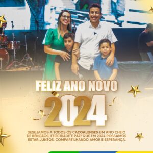 Cacoal, RO – À medida que o ano de 2023 se despede, o prefeito Adailton Fúria, acompanhado pela primeira-dama Joliane Fúria e seus filhos, estende uma mensagem calorosa e cheia de esperança a todas as famílias de Cacoal. Juntos, eles expressam o desejo de um 2024 repleto de realizações e felicidade para todos os cidadãos desta cidade abençoada.