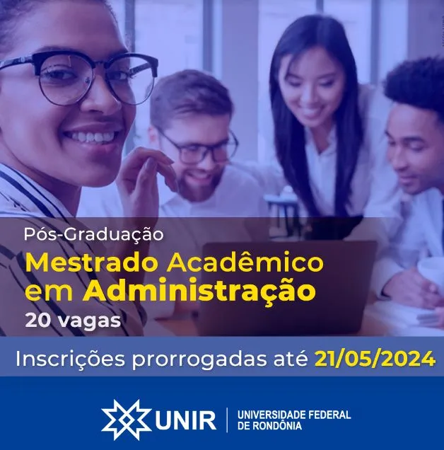O Programa de Pós-Graduação em Administração (PPGA) da Universidade Federal de Rondônia (UNIR) prorrogou as inscrições para a seleção de candidatos para o curso de Mestrado Acadêmico em Administração. As inscrições podem ser realizadas até o dia 21 de maio de 2024, neste link. São ofertadas 20 vagas para ingresso no segundo semestre de 2024.