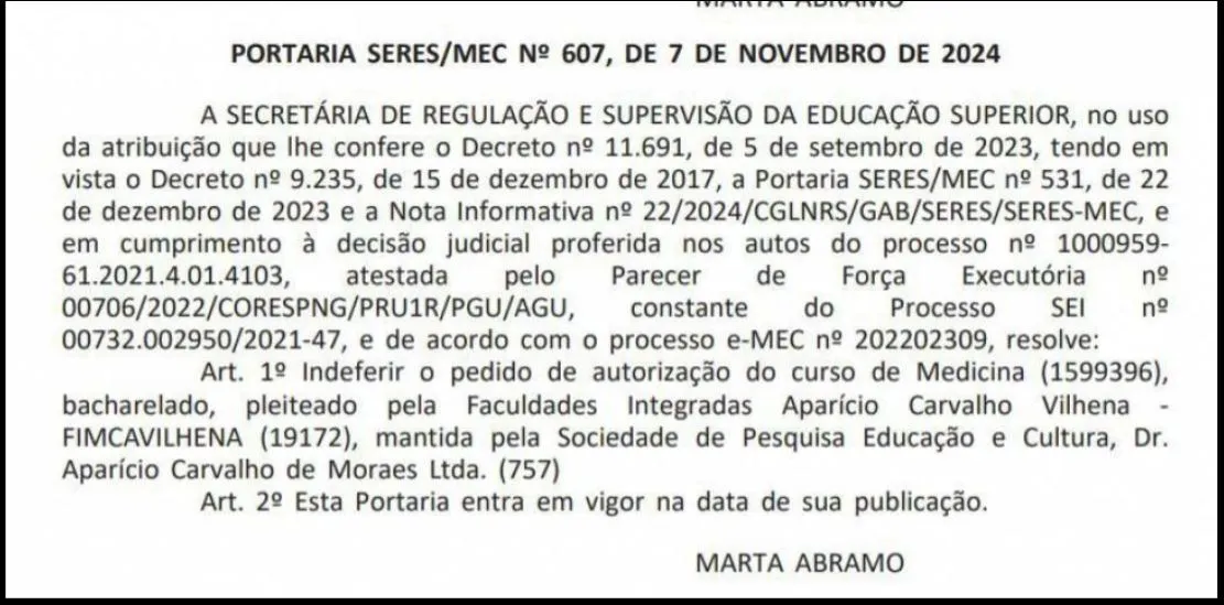 Está causando apreensão em Vilhena, já que a medida poder ter impacto em outras áreas além da educação superior, uma portaria publicada esta semana pelo Ministério da Educação, na qual é indeferido o pedido de autorização de um curso de medicina que já estava com alunos matriculados e assistindo aulas desde o início do ano na maior cidade do Cone Sul de Rondônia.