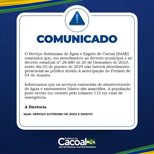 Cacoal, RO Em uma medida que acompanha estadual, o Serviço Autônomo de Água e Esgoto de Cacoal (SAAE) anunciou que não realizará atendimento presencial ao público no dia 02 de janeiro de 2024. A decisão segue a antecipação do feriado estadual de 04 de janeiro, conforme decreto estadual nº 28.680 de 20 de dezembro de 2023.