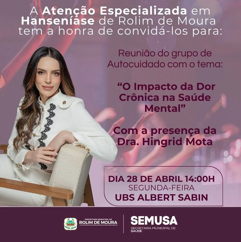A cidade de Rolim de Moura será palco de uma importante discussão sobre saúde no próximo dia 28 de abril. A Atenção Especializada em Hanseníase, vinculada à Secretaria Municipal de Saúde (SEMUSA), convida a população para participar da reunião do grupo de autocuidado, que abordará o tema: “O Impacto da Dor Crônica na Saúde Mental”.
